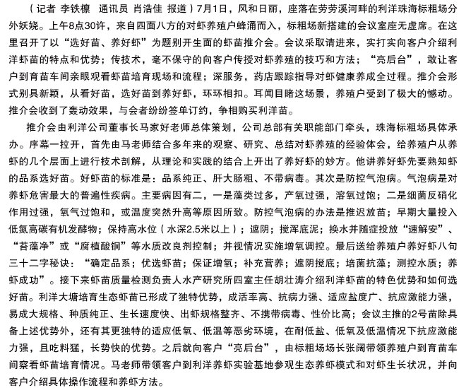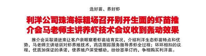 利洋公司珠海標(biāo)粗場(chǎng)召開(kāi)別開(kāi)生面的蝦苗推介會(huì)馬老師主講養(yǎng)蝦技術(shù)會(huì)議收到轟動(dòng)效果