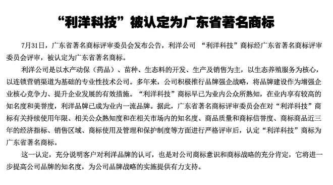 “利洋科技”被認定為廣東省著名商標(biāo)