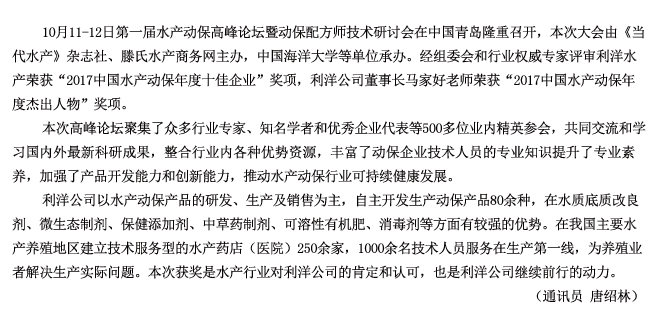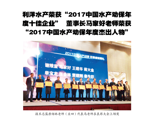 利洋水產榮獲“2017中國水產動保年度十佳企業(yè)” 董事長馬家好老師榮獲“2017中國水產動保年度杰出人物”