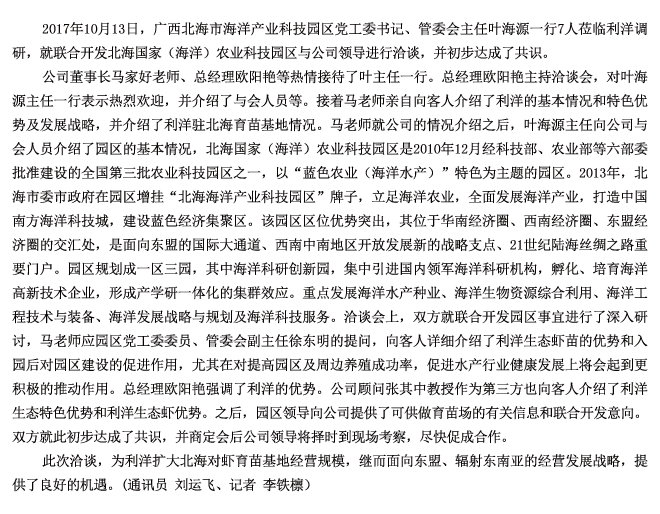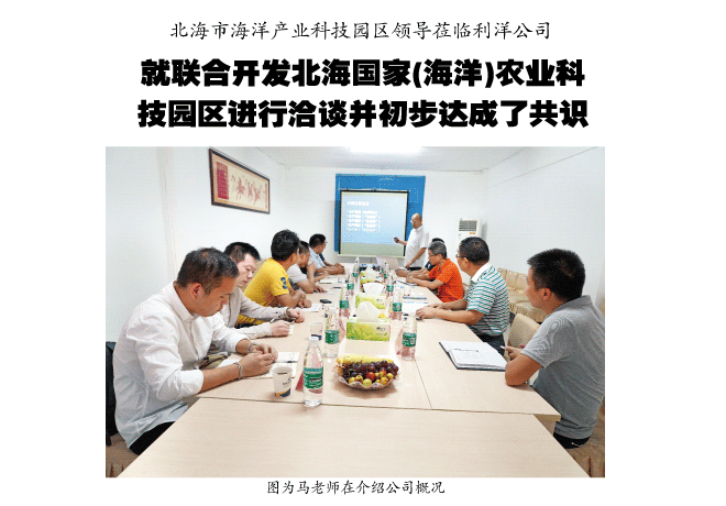 北海市海洋產(chǎn)業(yè)科技園區(qū)領(lǐng)導(dǎo)蒞臨利洋公司就聯(lián)合開發(fā)北海國(guó)家(海洋)農(nóng)業(yè)科技園區(qū)進(jìn)行洽談并初步達(dá)成