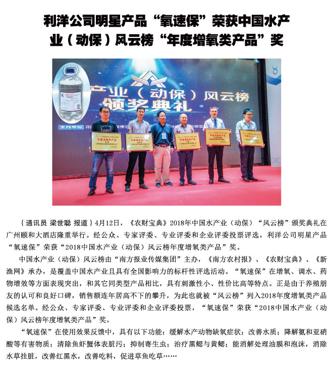 利洋公司明星產(chǎn)品“氧速?!睒s獲中國(guó)水產(chǎn)業(yè)(動(dòng)保)風(fēng)云榜“年度增氧類產(chǎn)品”獎(jiǎng)