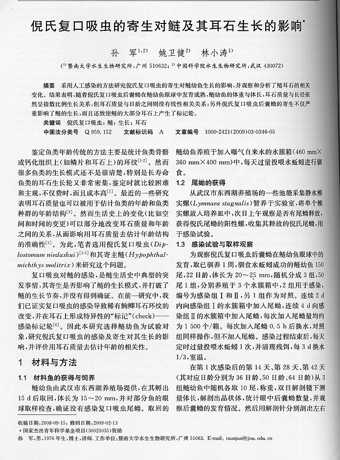 倪氏復(fù)口吸蟲的寄生對鰱及其耳石生長的影響1
