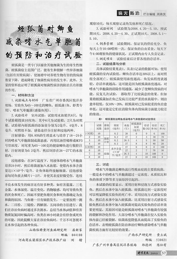 蛭弧菌對鯽魚感染嗜水氣單胞菌的預(yù)防和治療實驗