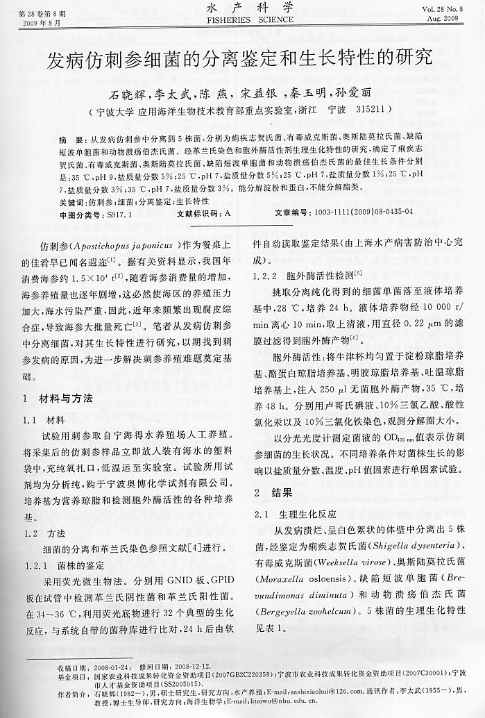 發(fā)病仿刺參細菌的分離鑒定和生長特性的研究1