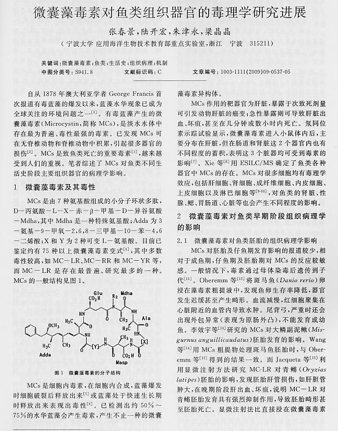 微囊藻毒素對魚類組織器官的毒理學(xué)研究進(jìn)展1