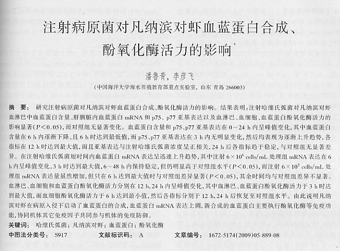 注射病原菌對凡納濱對蝦血藍蛋白合成、酚氧化酶活力的影響