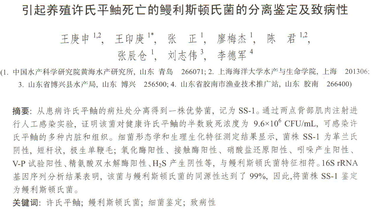 引起養(yǎng)殖許氏平鲉死亡的鰻利斯頓氏菌的分離鑒定及致病性