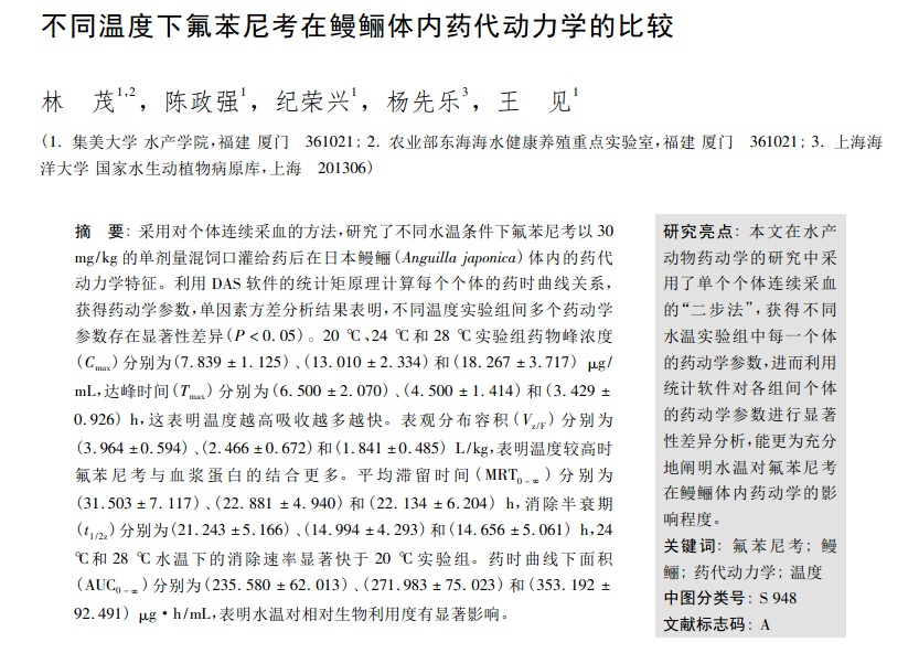 不同溫度下氟苯尼考在鰻鱺體內(nèi)藥代動(dòng)力學(xué)的比較