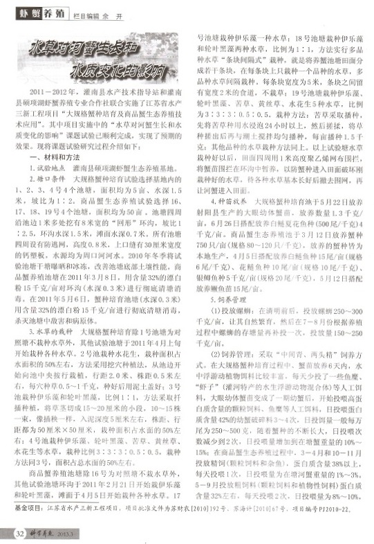 水草對河蟹生長和水質(zhì)變化的影響