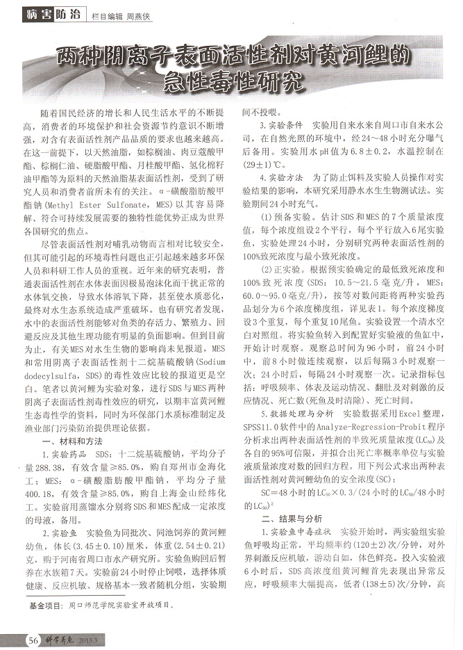 兩種陰離子表面活性劑對(duì)黃河鯉的急性毒性研究