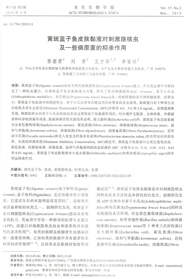 黃斑藍(lán)子魚皮膚黏液對刺激隱核蟲及一些病原菌的抑殺作用