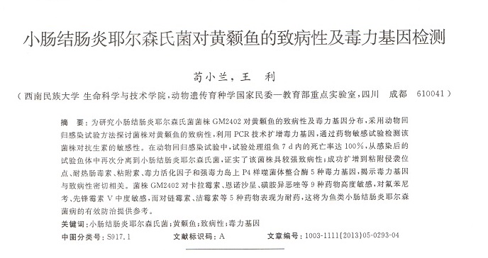 小腸結(jié)腸炎耶爾森氏菌對(duì)黃顙魚的致病性及毒力基因檢測(cè)