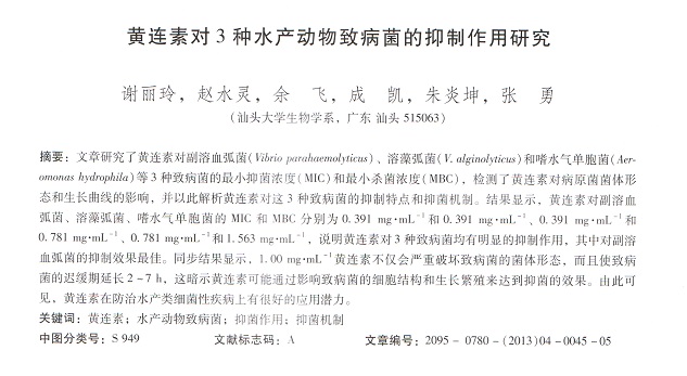 黃連素對3種水產(chǎn)動物致病菌的抑制作用研究