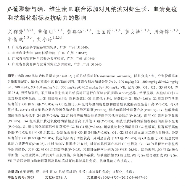 β-葡聚糖與硒、維生素E聯(lián)合添加對凡納濱對蝦生長、血清免疫和抗氧化指標(biāo)及抗病力的影響
