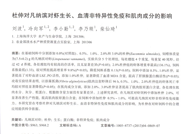 杜仲對凡納濱對蝦生長、血清非特異性免疫和肌肉成分的影響