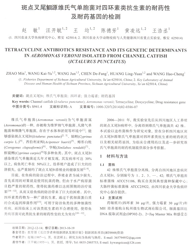 斑點(diǎn)叉尾鮰源維氏氣單胞菌對四環(huán)素類抗生素的耐藥性及耐藥基因的檢測