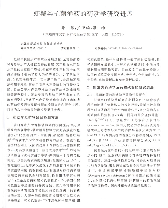 蝦蟹類(lèi)抗菌漁藥的藥動(dòng)學(xué)研究進(jìn)展