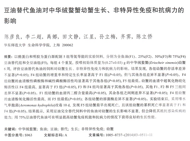 豆油替代魚油對(duì)中華絨螯蟹幼蟹生長、非特異性免疫和抗病力的影響