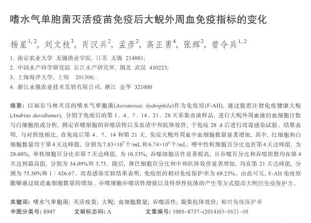 嗜水氣單胞菌滅活疫苗免疫后大鯢外周血免疫指標(biāo)的變化