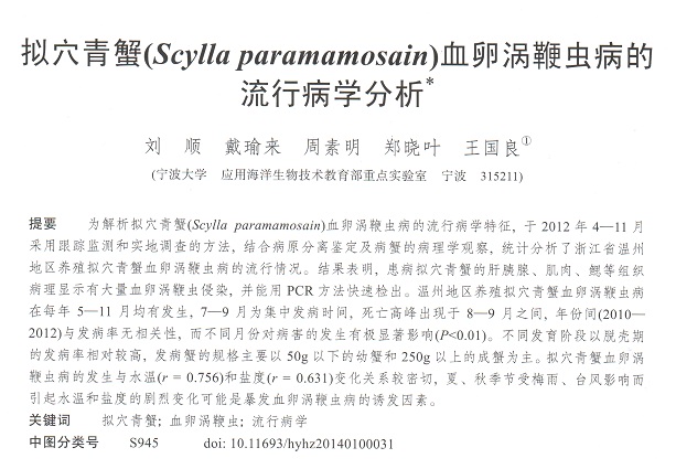 擬穴青蟹(Scylla paramamosain)血卵渦鞭蟲病的流行病學分析