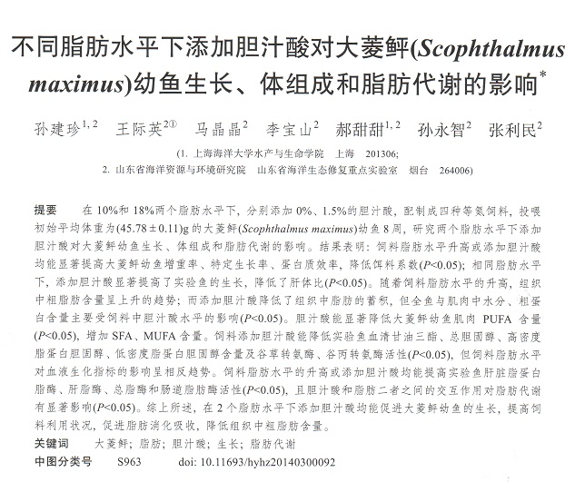 不同脂肪水平下添加膽汁酸對大菱鲆(Scophthalmus maximus)幼魚生長、體組成和脂肪代謝的影響