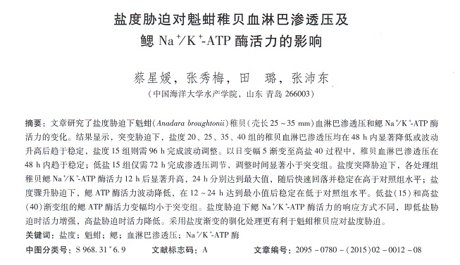 鹽度脅迫對魁蚶稚貝血淋巴滲透壓及鰓Na+/K+_ATP酶活力的影響