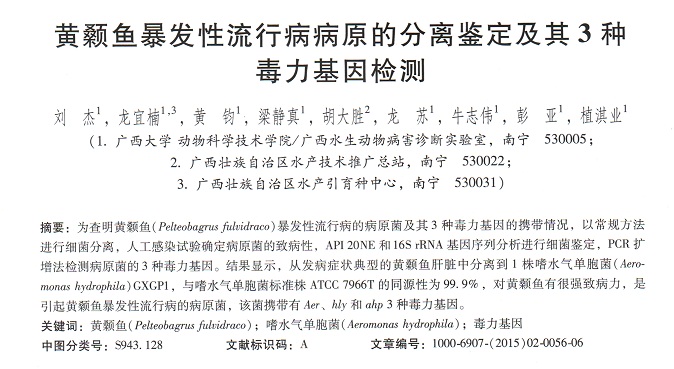 黃顙魚爆發(fā)性流行病病原的分離鑒定及其3種毒力基因檢測(cè)