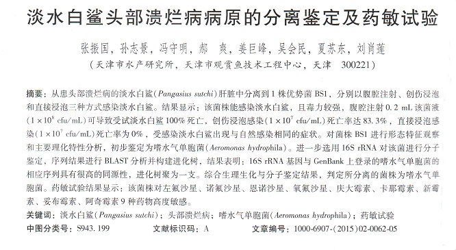 淡水白鯊頭部潰爛病病原的分離鑒定及藥敏試驗