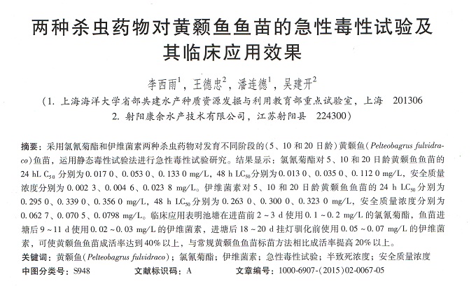 兩種殺蟲藥物對(duì)黃顙魚魚苗的急性毒性試驗(yàn)及其臨床應(yīng)用效果