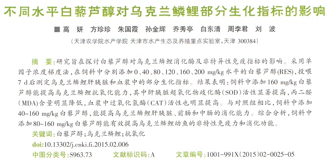 不同水平白藜蘆醇對烏克蘭鱗鯉部分生化指標(biāo)的影響