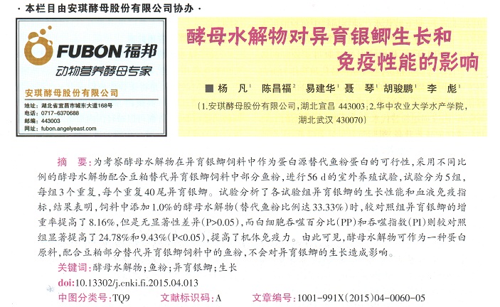酵母水解物對(duì)異育銀鯽生長(zhǎng)和免疫性能的影響