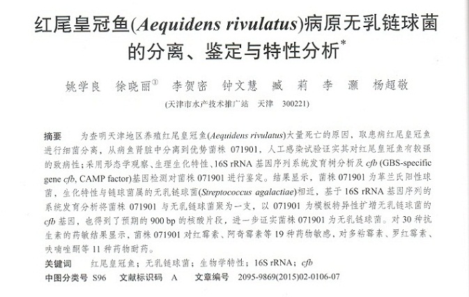 紅尾皇冠魚(Aequidens rivulatus)病原無乳鏈球菌的分離、鑒定與特性分析