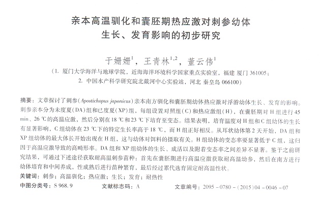 親本高溫馴化和囊胚期熱應(yīng)激對刺參幼體生長、發(fā)育影響的初步研究