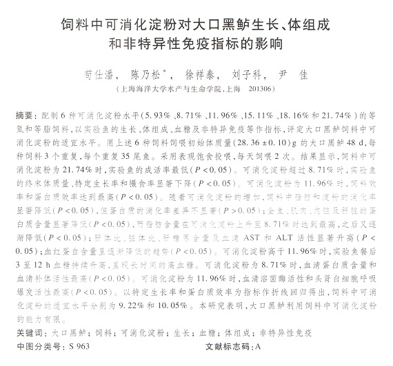 飼料中可消化淀粉對大口黑鱸生長、體組成和非特異性免疫指標的影響