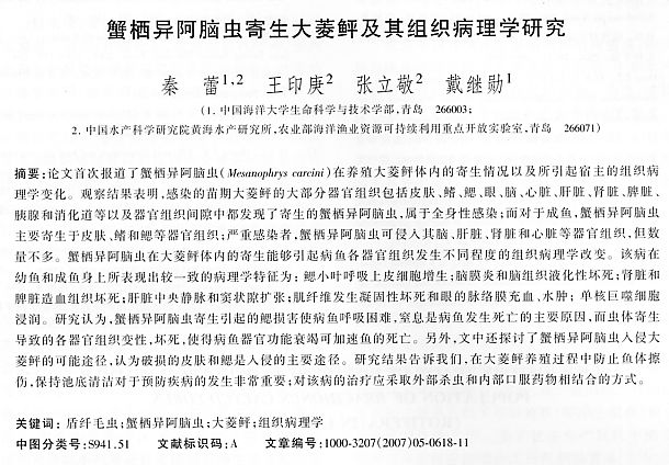 蟹棲異阿腦蟲寄生大菱鲆及其組織病理學(xué)研究