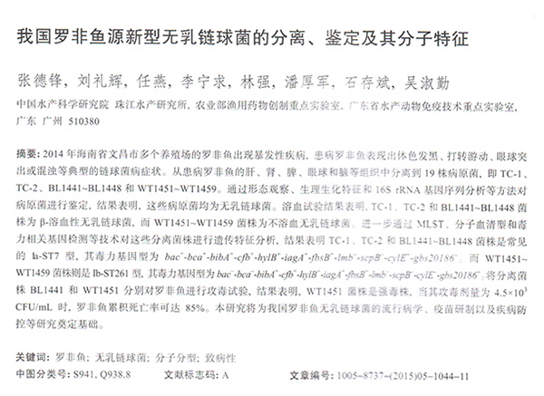 我國(guó)羅非魚源新型無(wú)乳鏈球菌的分離、鑒定及其分子特征