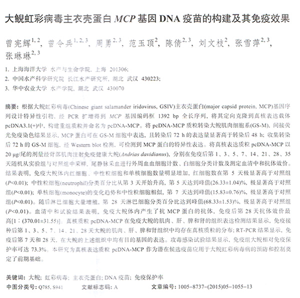 大鯢虹彩病毒主衣殼蛋白MCP基因DNA疫苗的構(gòu)建及其免疫效果