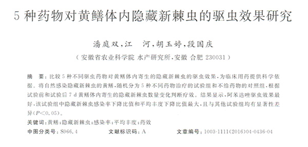 5種藥物對黃鱔體內(nèi)隱藏新棘蟲的驅蟲效果研究