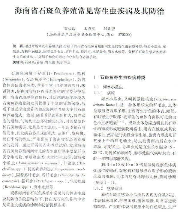 海南省石斑魚養(yǎng)殖常見寄生蟲疾病及其防治