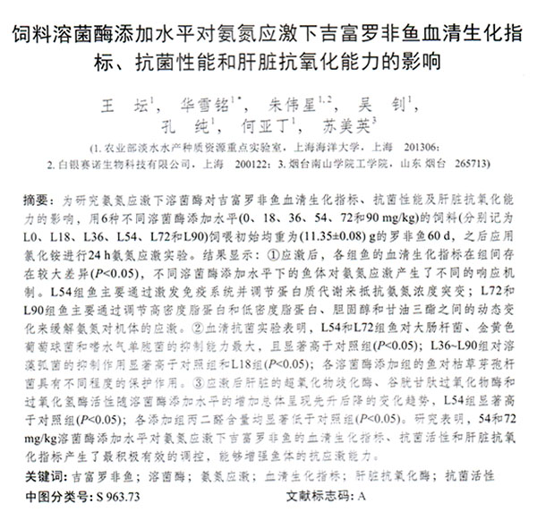 飼料溶菌酶添加水平對氨氮應激下吉富羅非魚血清生化指標、抗菌性能和肝臟抗氧化能力的影響