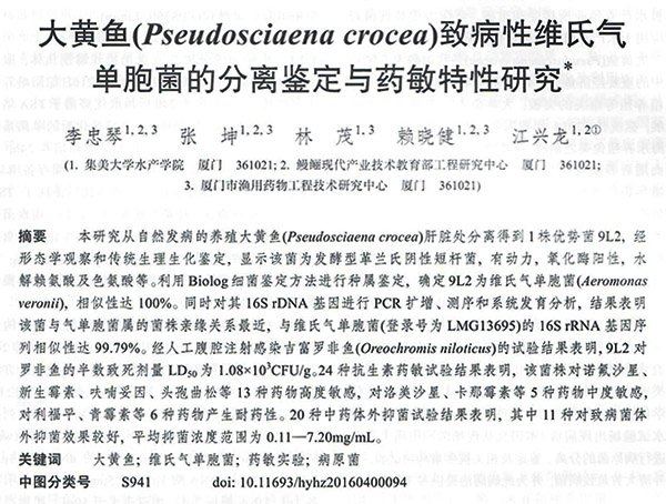 大黃魚(Pseudosciaena crocea)致病性維氏氣單胞菌的分離鑒定與藥敏特性研究