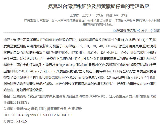 氨氮對(duì)臺(tái)灣泥鰍胚胎及卵黃囊期仔魚的毒理效應(yīng)