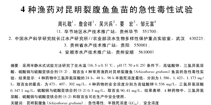 4種漁藥對昆明裂腹魚魚苗的急性毒性試驗
