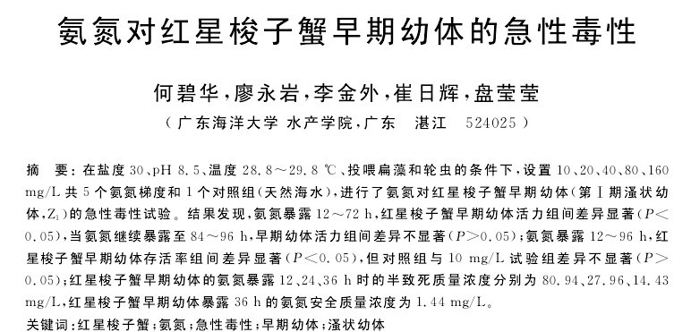 氨氮對紅星梭子蟹早期幼體的急性毒性