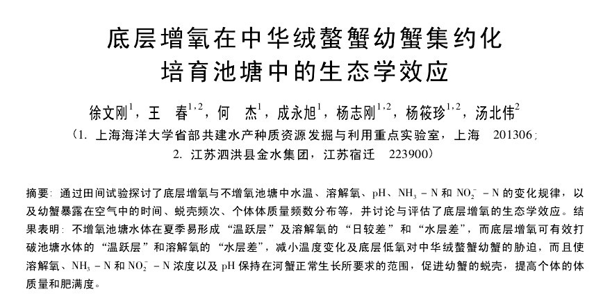 底層增氧在中華絨螯蟹幼蟹集約化培育池塘中的生態(tài)學效應