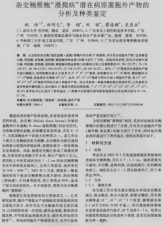 雜交鮑稚鮑“漫爬病”潛在病原菌胞外產(chǎn)物的分析及種類鑒定1