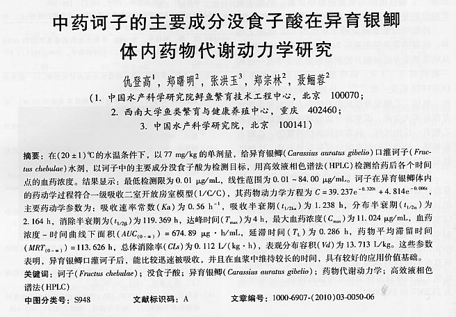 中藥訶子的主要成分沒食子酸在異育銀鯽體內(nèi)藥物代謝動力學(xué)研究