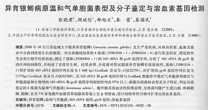 異育銀鯽病原溫和氣單胞菌表型及分子鑒定與溶血素基因檢測