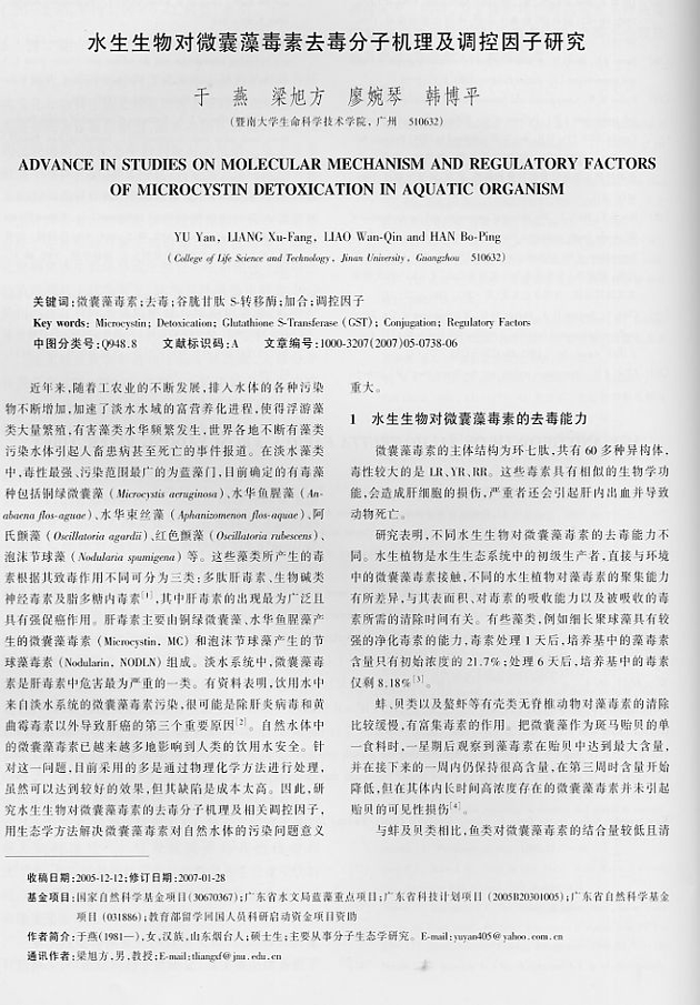 水產(chǎn)生物對微囊藻毒素去毒分子機理及調(diào)控因子研究1