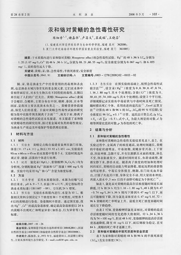 汞和鉻對(duì)黃鱔的急性毒性研究1